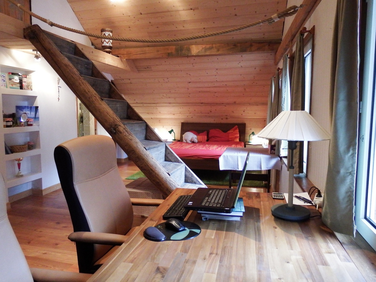 ... ahol élünk. Egy szállodában, a 2. emeleten van egy számtalan ajtó. Azon ha bekukkantassz minket megtalálsz. Végülis nem olyan kicsi ez a szoba, egy kisebb lakásnak mondható. Kialakítottunk benne egy hálórészt, dolgozósarkot, mini konyhát (mely a mikró és édességek jelenlétét jelenti), kanapé ha pihenni vágynánk, egy gardrób szoba és két fürdőszoba (mégiscsak ketten vagyunk..). Van egy elég nagy padlás is, használni a tároláson kívül sajnos nem tudjuk egyenlőre (tervek szerint ismerősök tudnának ott aludni) mert valamely része beázott és ennek nyomozása még tart. Az hogy befejezettnek tekintsük a lakást, pontosan 8 hónapunkba tellett, plusz 3 hétbe hogy legyen időm lefényképezni. Ha eddig nem hittétek, mennyire elfoglaltak vagyunk, ezután biztos elhiszitek :)